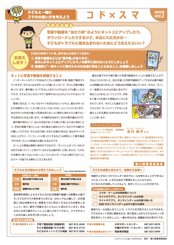 2025年12月、香川県教育委員会が発行しているコラム「コド×スマ 2025年 vol.2」に、弊社代表 目代純平が記事を執筆しました。「子どもと一緒にスマホの使い方を考えよう」をテーマに、保護者の方々から寄せられたお悩みにお答えした内容になっております。今回は「写真や動画の著作権」についてお伝えします。