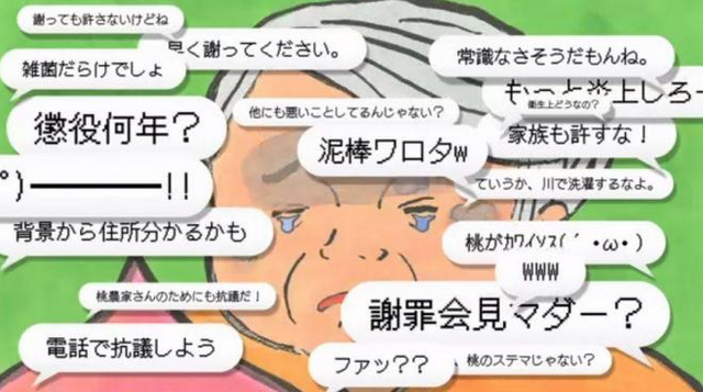 主にテレビやラジオで放送されていますが、そのストーリーは、おばあさんが川を流れてきた桃を拾ったところ、「窃盗だろw」、「通報!通報!」、「桃の気持ち考えたことあるのか!」、「謝罪会見マダー?」、「背景から住所分かるかも」、「電話で抗議しよう」、「もっと炎上しろー!」などなど、ネット上でよく見かけるような匿名の非難、中傷コメントが殺到し、おばあさんがおろおろと困惑する、というものです。